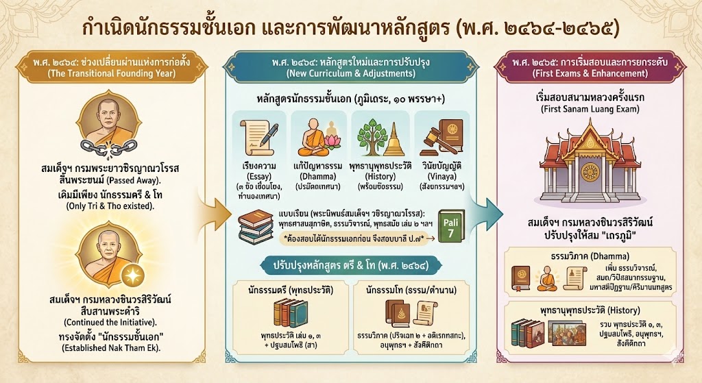 In B.E. 2464 (1921), Somdet Phra Maha Samana Chao Krom Phra Vajirananavarorasa passed away. Consequently, the Nak Tham Ek (Advanced Level Dhamma Scholar) curriculum, which he had envisioned, had not yet been established during his era. At that time, Dhamma education consisted of only two levels: Nak Tham Tri (Elementary) and Nak Tham Tho (Intermediate).