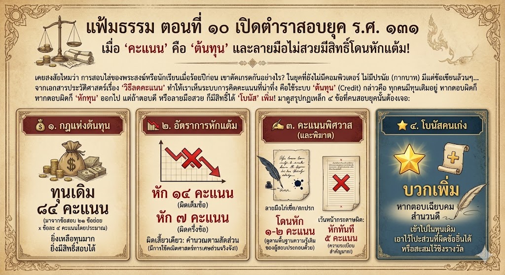 จากเอกสารประวัติศาสตร์เรื่อง “วิธีลดคะแนน” ทำให้เราเห็นระบบการคิดคะแนนที่น่าทึ่ง คือใช้ระบบ “ต้นทุน” (Credit) กล่าวคือ ทุกคนมีทุนเดิมอยู่ หากตอบผิดก็ “หักทุน” ออกไป แต่ถ้าตอบดี หรือลายมือสวย ก็มีสิทธิ์ได้ “โบนัส” เพิ่ม! มาดูสรุปกฎเหล็ก ๔ ข้อที่คนสอบยุคนั้นต้องเจอ