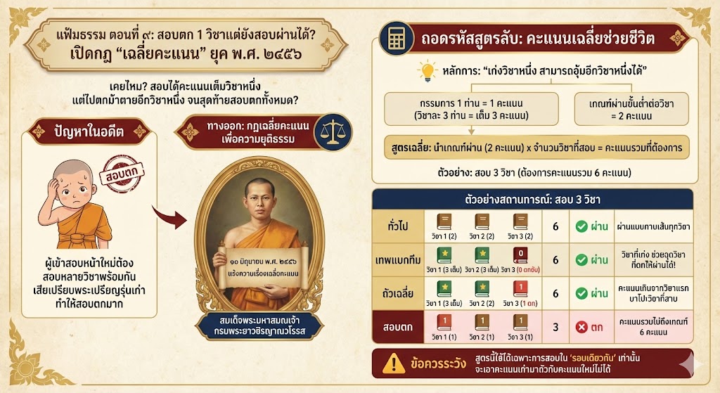- ความแฟร์ของระบบ: ระบบเฉลี่ยคะแนนนี้สะท้อนให้เห็นว่า การวัดผลไม่ได้ต้องการคนเก่งทุกเรื่อง แต่ต้องการคนที่ “มีความรู้รวมๆ อยู่ในเกณฑ์ที่ยอมรับได้” เพื่อให้อยู่ในเพศสมณะได้อย่างมีคุณภาพ
