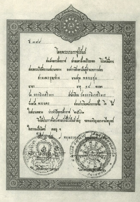 เมื่อสอบผ่านครบตามหลักสูตร (ในสมัยนั้นเรียกว่า “ชั้นนวกะ” หรือระดับต้น) ก็จะได้รับสิ่งนี้ครับ ข้อความในใบประกาศฯ มีความไพเราะและศักดิ์สิทธิ์มาก โดยมีการอ้างถึงพระราชประสงค์ของ รัชกาลที่ ๖ ไว้ในย่อหน้าแรกด้วย