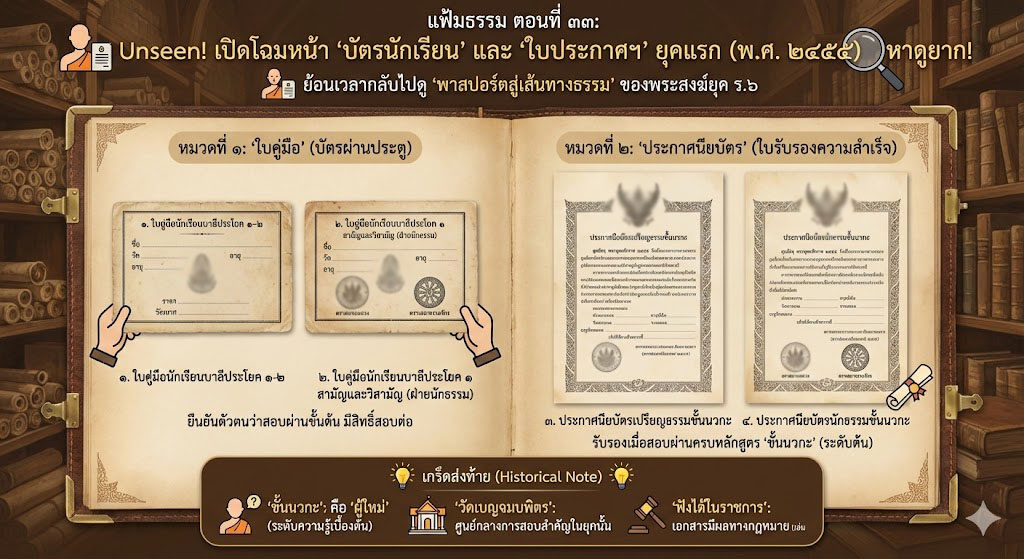 คุณเคยสงสัยไหมว่า… สมัยก่อนเวลาพระเณรสอบได้ เขาใช้อะไรเป็นหลักฐาน? จะมีบัตรนักศึกษาเหมือนเราไหม? วันนี้ “แฟ้มธรรม” ขอพาคุณย้อนเวลากลับไปในปี พ.ศ. ๒๔๕๕ (สมัยรัชกาลที่ ๖) ไปดูหน้าตาของเอกสารสำคัญ 4 ฉบับ ที่เปรียบเสมือน “พาสปอร์ตสู่เส้นทางธรรม” ของพระสงฆ์ยุคนั้น