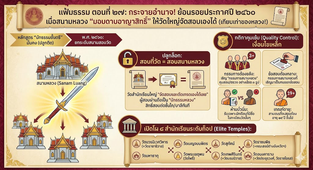 🔓 ปลดล็อก: สอบที่วัด = สอบสนามหลวง: จากเดิมที่วัดทำหน้าที่แค่ “คัดกรองคน” ส่งไปสอบสนามกลาง ประกาศนี้อนุญาตให้วัดสำนักเรียนใหญ่ๆ “จัดสอบและตัดเกรดเองได้เลย” ใครสอบผ่านที่วัด ก็ให้ถือว่าเป็น “นักธรรมหลวง” มีสิทธิ์ไปสอบต่อในชั้นที่สูงขึ้น (ชั้นโท หรือ บาลี) ได้ทันที