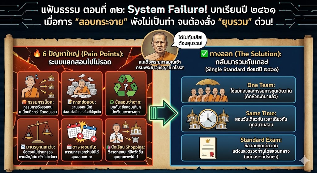 - 📝 ภาระข้อสอบ: กรรมการคนเดิม ต้องมานั่งแต่งข้อสอบใหม่ให้ทุกวัดที่เชิญไป (งานงอกหนักมาก)