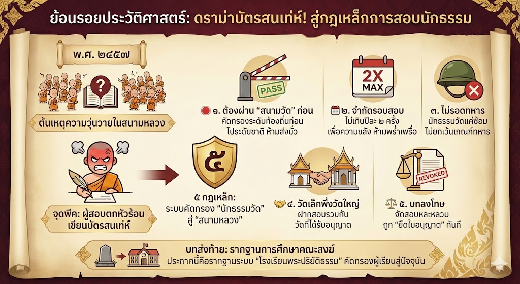 คุณเคยสงสัยไหมว่า ทำไมการสอบนักธรรมถึงเข้มงวดนัก? เรื่องนี้มีที่มา… ย้อนกลับไปในปี พ.ศ. ๒๔๕๗ การสอบในสนามหลวงเริ่มวุ่นวาย เมื่อผู้เข้าสอบมีจำนวนมากเกินไป แถมบางรูปความรู้ยังไม่แน่นพอ แต่ที่พีคที่สุดคือ “พฤติกรรมของผู้สอบตก”