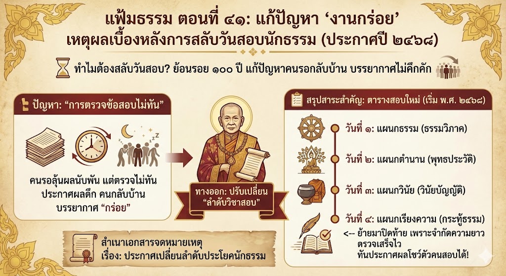 เคยสงสัยไหมว่าทำไมตารางสอบนักธรรมถึงจัดวิชาเรียงความ (กระทู้ธรรม) ไว้ท้ายสุด? หรือบางยุคก็ไว้ต้นสุด? ย้อนกลับไปเมื่อ ๑๐๐ ปีก่อน ในสมัยรัชกาลที่ ๖ การสอบนักธรรมได้รับความนิยมอย่างถล่มทลาย บางจังหวัดมีคนมาร่วมลุ้นผลสอบนับพันคน! แต่ปัญหาที่เกิดขึ้นคือ “การตรวจข้อสอบไม่ทัน” ทำให้การประกาศผลล่าช้าจนดึกดื่น ผู้คนรอไม่ไหวจนทยอยกลับบ้าน ทำให้บรรยากาศที่ควรจะครึกครื้นกลับ “กร่อย” ลงไปถนัดตา