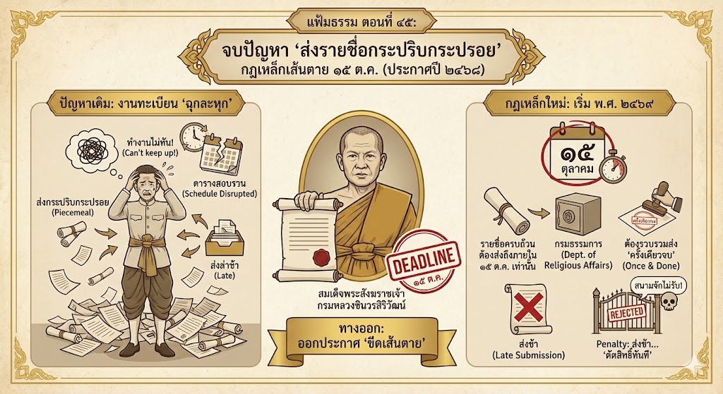 แฟ้มธรรม ตอนที่ ๔๕: จบปัญหา “ส่งรายชื่อกระปริบกระปรอย” กฎเหล็กเส้นตาย ๑๕ ต.ค. (ประกาศปี ๒๔๖๘)