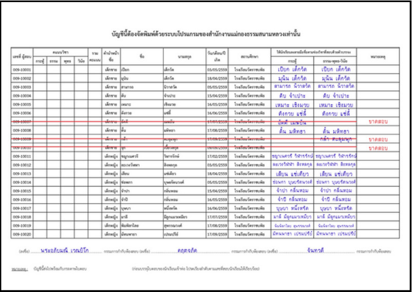 - ให้ขีดเส้นแดงทับรายชื่อหรือช่องเลขประจำตัวของผู้ขาดสอบให้ชัดเจน