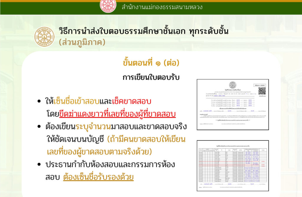 - จัดทำ “บัญชียอดจำนวนนักเรียนส่งสอบ-ขาดสอบ-คงสอบ” ตามแบบฟอร์มมาตรฐานที่สนามหลวงแผนกธรรมกำหนด
