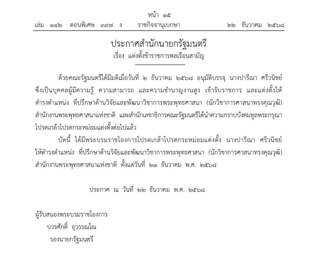 เว็บไซต์ราชกิจจานุเบกษา เผยแพร่ประกาศสำนักนายกรัฐมนตรี เรื่อง แต่งตั้งข้าราชการพลเรือนสามัญ โดยมีพระบรมราชโองการโปรดเกล้าโปรดกระหม่อมแต่งตั้ง นางปารีณา ศรีวนิชย์ ผู้เชี่ยวชาญด้านกฎหมายและอดีตผู้บริหารระดับสูงจากสถาบันการศึกษาชั้นนำ ให้ดำรงตำแหน่ง ที่ปรึกษาด้านวิจัยและพัฒนาวิชาการพระพุทธศาสนา (นักวิชาการศาสนาทรงคุณวุฒิ) สังกัดสำนักงานพระพุทธศาสนาแห่งชาติ ตั้งแต่วันที่ ๒๑ ธันวาคม พ.ศ. ๒๕๖๘ เป็นต้นไป