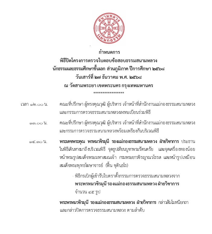 กรุงเทพมหานคร (๒๗ ธันวาคม ๒๕๖๘) – สำนักงานแม่กองธรรมสนามหลวง จัดพิธีปิดโครงการตรวจใบตอบข้อสอบธรรมสนามหลวง นักธรรมและธรรมศึกษาชั้นเอก ส่วนภูมิภาค ประจำปีการศึกษา ๒๕๖๘ อย่างเป็นทางการ โดยได้รับเมตตาจากพระเถรานุเถระคณะผู้บริหาร และคณะกรรมการตรวจข้อสอบร่วมพิธีอย่างพร้อมเพรียง ณ วัดสามพระยา วรวิหาร เขตพระนคร กรุงเทพมหานคร