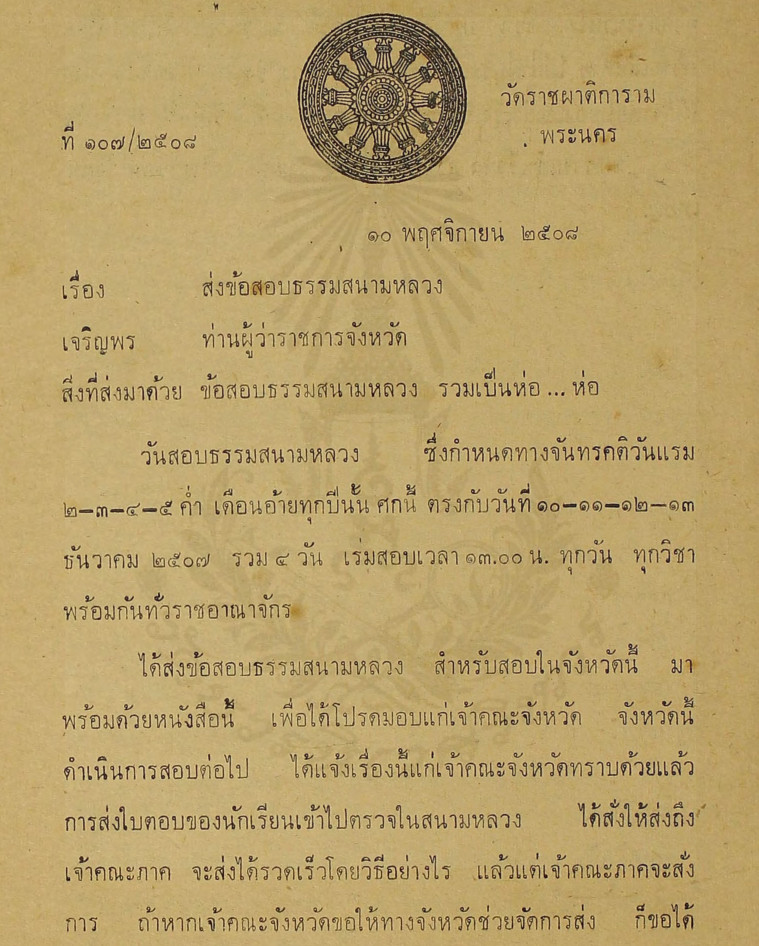 ลองนึกภาพจดหมายฉบับหนึ่งที่ส่งออกจาก วัดราชผาติการาม ลงวันที่ 10 พฤศจิกายน 2508 จ่าหน้าถึงผู้ว่าราชการจังหวัดทั่วประเทศ. รูปแบบหนังสือราชการในสมัยนั้นสะท้อนถึงการให้เกียรติและความสุภาพลุ่มลึก การใช้คำขึ้นต้นว่า “เจริญพร” แทนการใช้คำว่า “เรียน” แบบหนังสือราชการทั่วไป เป็นการรักษาฐานะของบรรพชิตในขณะที่ยังคงความถูกต้องตามระเบียบงานสารบรรณ.