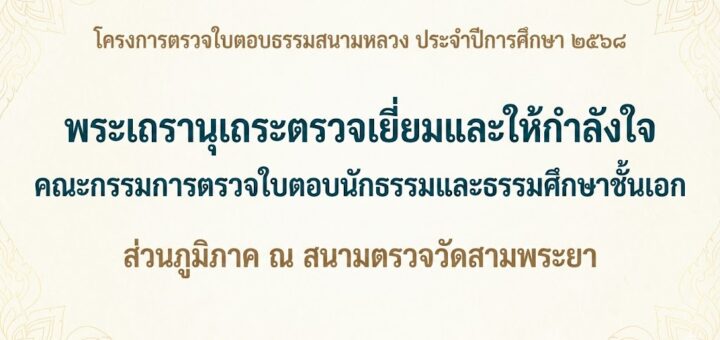 (กรุงเทพมหานคร – ๑๗ ธันวาคม ๒๕๖๘) – สำนักงานแม่กองธรรมสนามหลวง ประกาศรายชื่อคณะกรรมการตรวจใบตอบข้อสอบธรรมสนามหลวง ระดับชั้นเอก (ส่วนภูมิภาค) อย่างเป็นทางการ เตรียมพร้อมเข้าสู่กระบวนการตรวจประเมินผลในช่วงปลายเดือนธันวาคมนี้ ณ วัดสามพระยา